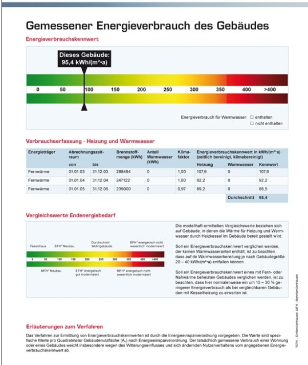 Der Energieausweis besteht aus einem Dokument mit mehreren Seiten. Auf Seite 2 sind bedarfsorientierte Angaben, Seite 3 ist ausgefüllt, wenn die Werte auf verbrauchsorientierten Daten basieren. Dargestellt werden die Ergebnisse, insbesondere der Energieverbrauchskennwert – nach jetzigem Stand – im Wesentlichen in Form einer Farbskala zwischen grün und rot. Wer viel rot sieht, hat ein Haus mit schlechtem Energiestandard. Der Energieausweis ist gesetzlich verpflichtend und muss potentiellen Käufern oder Mietern auf Wunsch vorgelegt werden können.